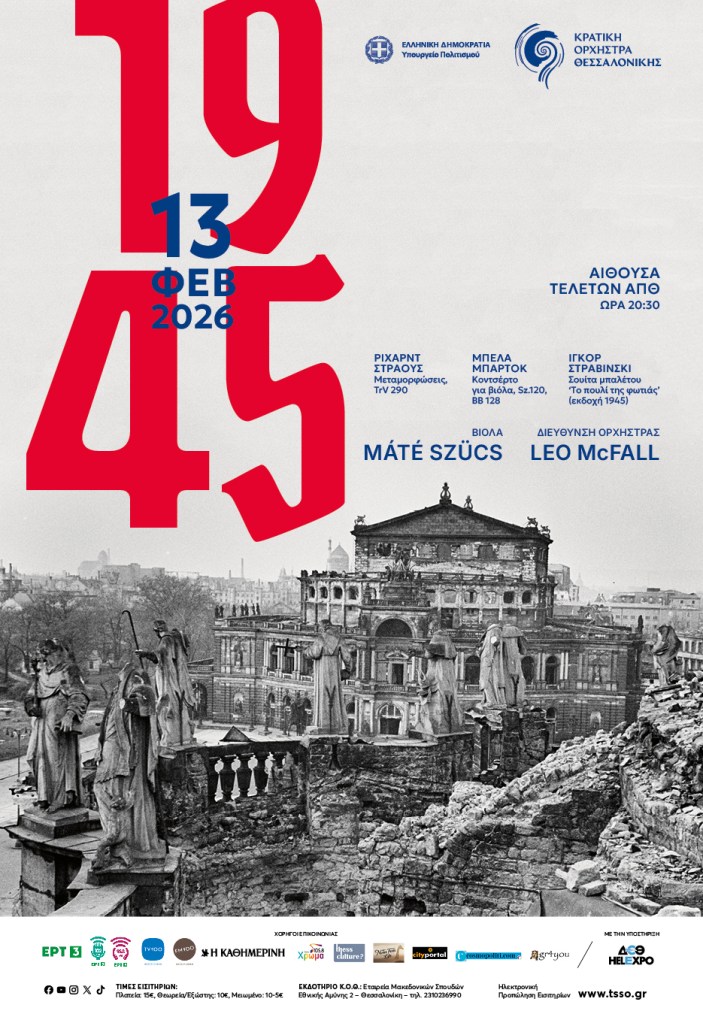 Η Κρατική Ορχήστρα Θεσσαλονίκης παρουσιάζει τρία αριστουργήματα που γράφτηκαν το 1945, καθώς πλησίαζε το τέλος του Β’ Παγκοσμίου Πολέμου, με τους δημιουργούς τους να αντιμετωπίζουν από διαφορετική σκοπιά το μέλλον. Εκλεκτός καλεσμένος της Κ.Ο.Θ. στη συναυλία αυτή ο κορυφαίος βιολίστας της Φιλαρμονικής του Βερολίνου Μάτε Σουτς, ενώ διευθύνει ο εξαίρετος Βασικός Αρχιμουσικός της Λίο Μακ Φωλ.