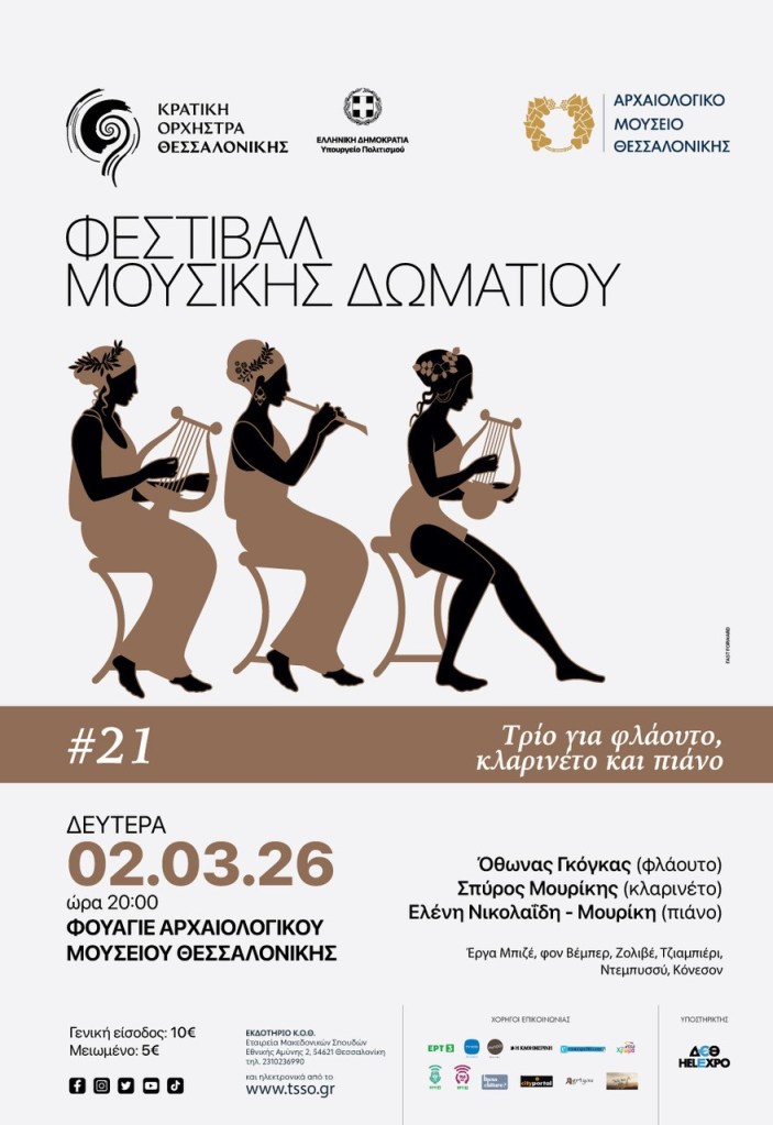Το επιτυχημένο Φεστιβάλ Μουσικής Δωματίου που συνδιοργανώνουν η Κρατική Ορχήστρα Θεσσαλονίκης και το Αρχαιολογικό Μουσείο Θεσσαλονίκης, με την υποστήριξη του Υπουργείου Πολιτισμού, συνεχίζεται με τρεις σπουδαίους μουσικούς, τους Όθωνα Γκόγκα (φλάουτο), Σπύρο Μουρίκη (κλαρινέτο) και Ελένη Νικολαΐδη – Μουρίκη (πιάνο), που ενώνουν τις δυνάμεις τους σε ένα ποικίλο πρόγραμμα, με διασκευές διάσημων έργων, αλλά και πρωτότυπες δημιουργίες για το συγκεκριμένο συνδυασμό οργάνων.