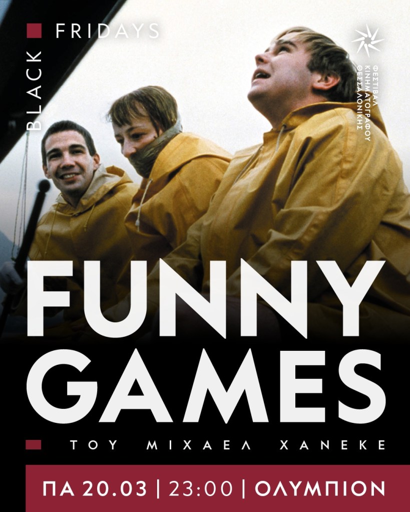 Οι Black Fridays του Φεστιβάλ, που κόβουν βόλτες στα πιο απαγορευμένα και σκοτεινά μονοπάτια του σινεμά, επιστρέφουν την Παρασκευή 20 Μαρτίου (23:00), στο Ολύμπιον, με μία από τις πιο σοκαριστικές, αμφιλεγόμενες και ανατρεπτικές ταινίες του σύγχρονου σινεμά, το αξέχαστο Funny Games (1997) του Μίχαελ Χάνεκε.