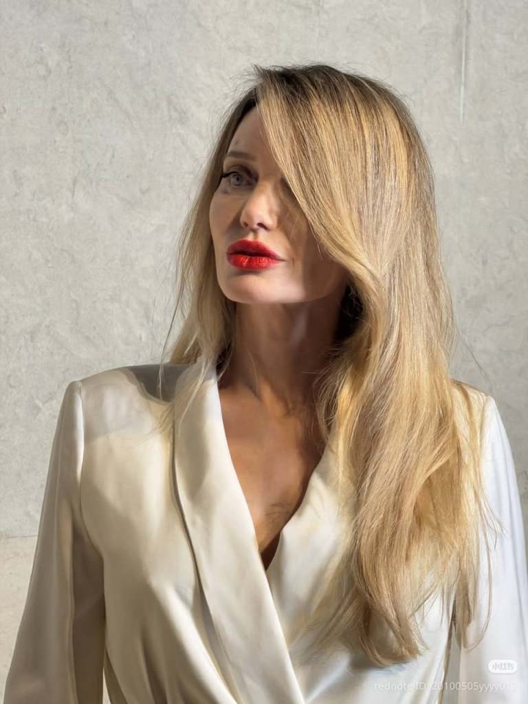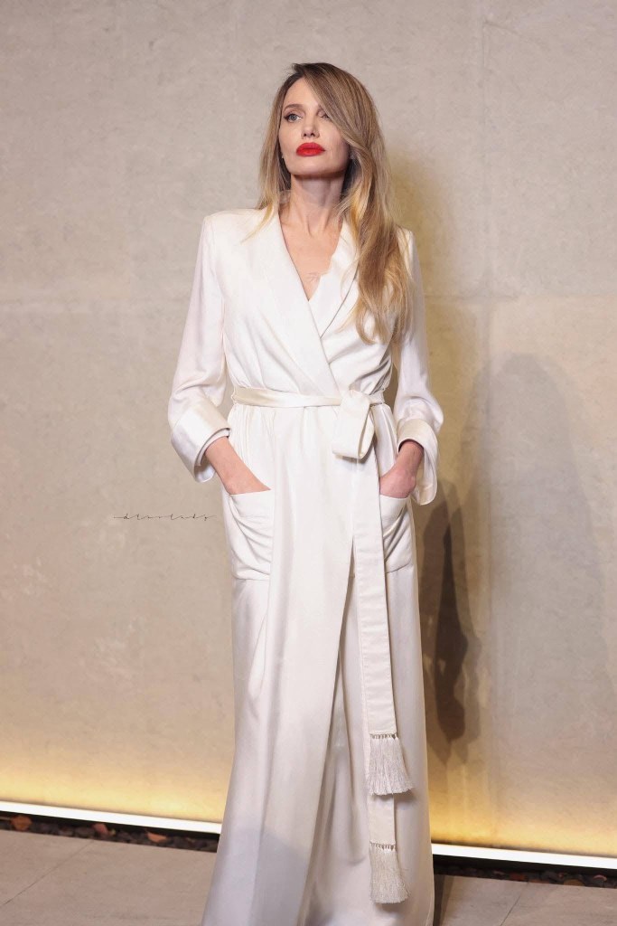 Στην εκδήλωση του Tom Ford στο πλαίσιο της Εβδομάδας Μόδας της Σανγκάης, η Τζολί εντυπωσίασε με ένα λευκό σατέν φόρεμα σε στιλ ρόμπας, το οποίο συνδύασε με γεμάτα, έντονα κόκκινα χείλη, χωρίς μάσκαρα και με ελάχιστο μακιγιάζ. Μαζί με το μακιγιάζ εμπνευσμένο από το γαλλικό στιλ, η ηθοποιός αποκάλυψε ένα πιο ανοιχτό, ψυχρό ξανθό χρώμα μαλλιών, ακολουθώντας την τάση των ψυχρών αποχρώσεων που βλέπουμε τελευταία. Η Τζολί χτένισε τα μαλλιά της με βαθιά χωρίστρα στο πλάι, αφήνοντάς τα να πέφτουν φυσικά στο πρόσωπό της, αποκαλύπτοντας τις πιο σκούρες ρίζες της.