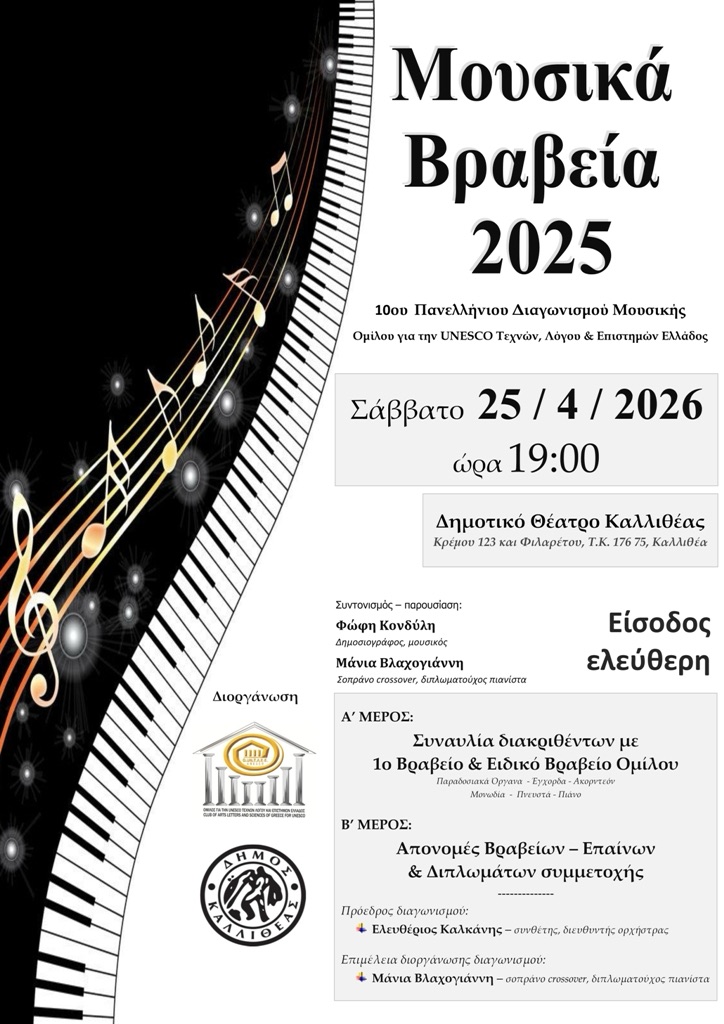 Ο Όμιλος για την UNESCO Τεχνών, Λόγου & Επιστημών Ελλάδος και ο Δήμος Καλλιθέας σας προσκαλούν το Σάββατο 25 Απριλίου 2026 και ώρα 19.00 στην τελετή απονομής των βραβείων του 10ου Πανελλήνιου Διαγωνισμού Μουσικής 2025, για παιδιά και νέες – νέους μουσικούς 9 – 30 ετών. Η εκδήλωση φιλοξενείται στο Δημοτικό Θέατρο Καλλιθέας (Κρέμου 123 και Φιλαρέτου, Τ.Κ. 176 75).