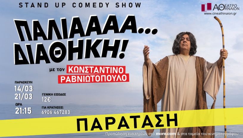 Η νέα stand up comedy παράσταση του Κωνσταντίνου Ραβνιωτόπουλου, το 6ο του πλέον solo special είναι εμπνευσμένο φυσικά από την Παλαιά Διαθήκη… Συνεχίστε την ανάγνωση Δωρεάν διπλές προσκλήσεις για την stand up comedy «Παλιάααα… Διαθήκη»