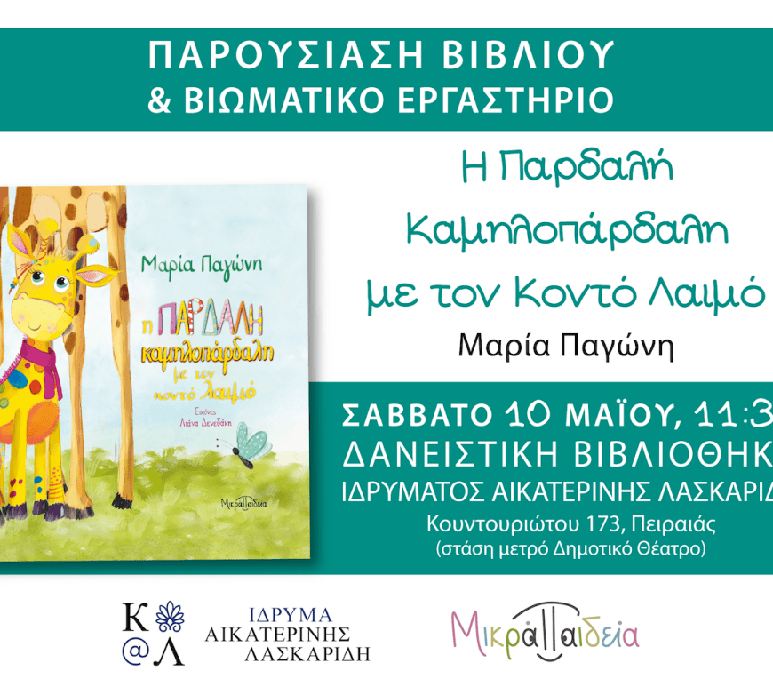 Η Δανειστική Βιβλιοθήκη του Ιδρύματος Αικατερίνης Λασκαρίδη και οι εκδόσεις ΜΙΚΡΑ ΠΑΙΔΕΙΑ σάς προσκαλούν σε ένα βιωματικό εργαστήριο για παιδιά και γονείς Συνεχίστε την ανάγνωση Η παρδαλή Καμηλοπάρδαλη με τον Κοντό Λαιμό: Βιωματικό εργαστήριο για παιδιά και γονείς
