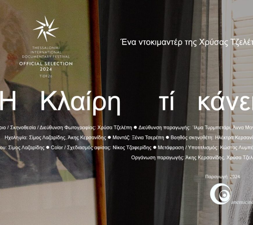 Η Κινηματογραφική Λέσχη Solaris συνεργάζεται με το Κινηματοθέατρο Αθήναιον, στη Θεσσαλονίκη, Βασιλίσσης Όλγας 35. Ξεκινώντας τη νέα περίοδο προβάλλουμε την ταινία-ντοκιμαντέρ «Η Κλαίρη τι κάνει;», της Χρύσας Τζελέπη. Η προβολή θα γίνει την Πέμπτη, 18 Απριλίου 2024, στις 21.00 παρουσία των συντελεστών της. Πρόκειται για ένα πολύ καλό δείγμα direct cinema που, σε αντίθεση με άλλα δείγματα αυτού του ρεύματος, έχει τέτοιο ρυθμό που κρατά … Συνεχίστε την ανάγνωση Προβολή ταινίας-ντοκιμαντέρ «Η Κλαίρη τι κάνει;» στο Θέατρο Αθήναιον